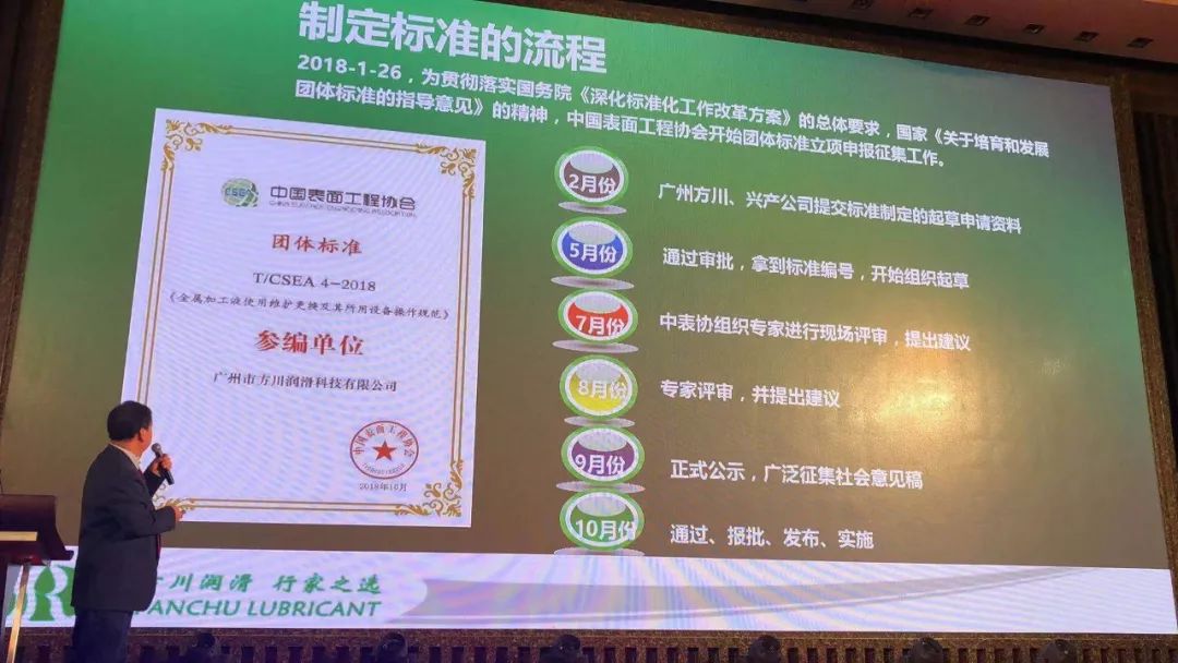 今年我們方川發布了兩項有關切削液的團體標準,分別是《金屬加工液使用維護更換及其所用設備操作規范》和《無硫磷氯元素添加劑的切削油》。今年協會年會由我們李茂生博士來解讀標準。